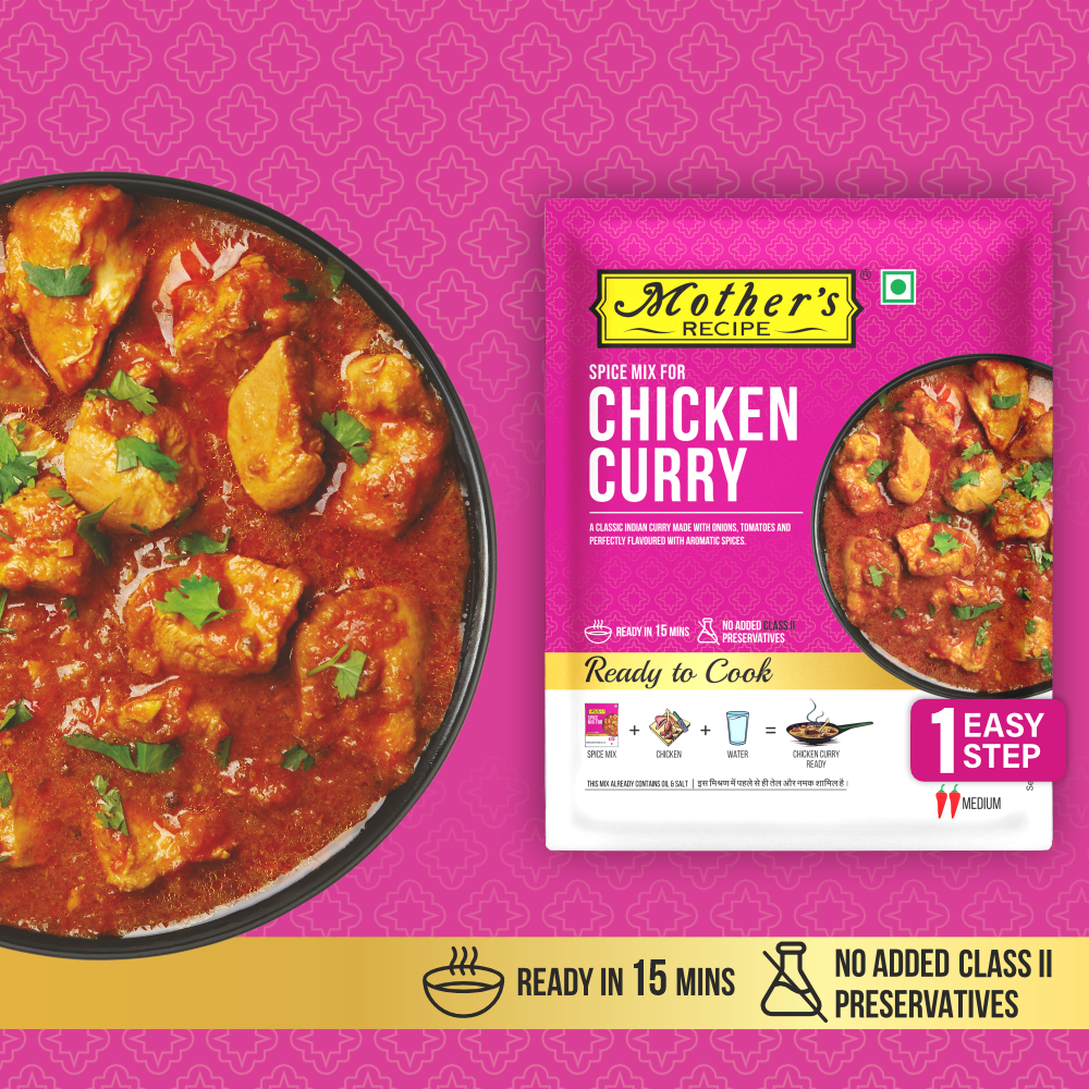 How to make- Take 500g chicken pieces, entire contents of Mother’s recipe chicken curry mix & 500ml of water in a pan. Mix & bring the content to a boil, then cover the vessel and simmer on low flame for 15-20 minutes till the chicken is cooked. Stir occasionally