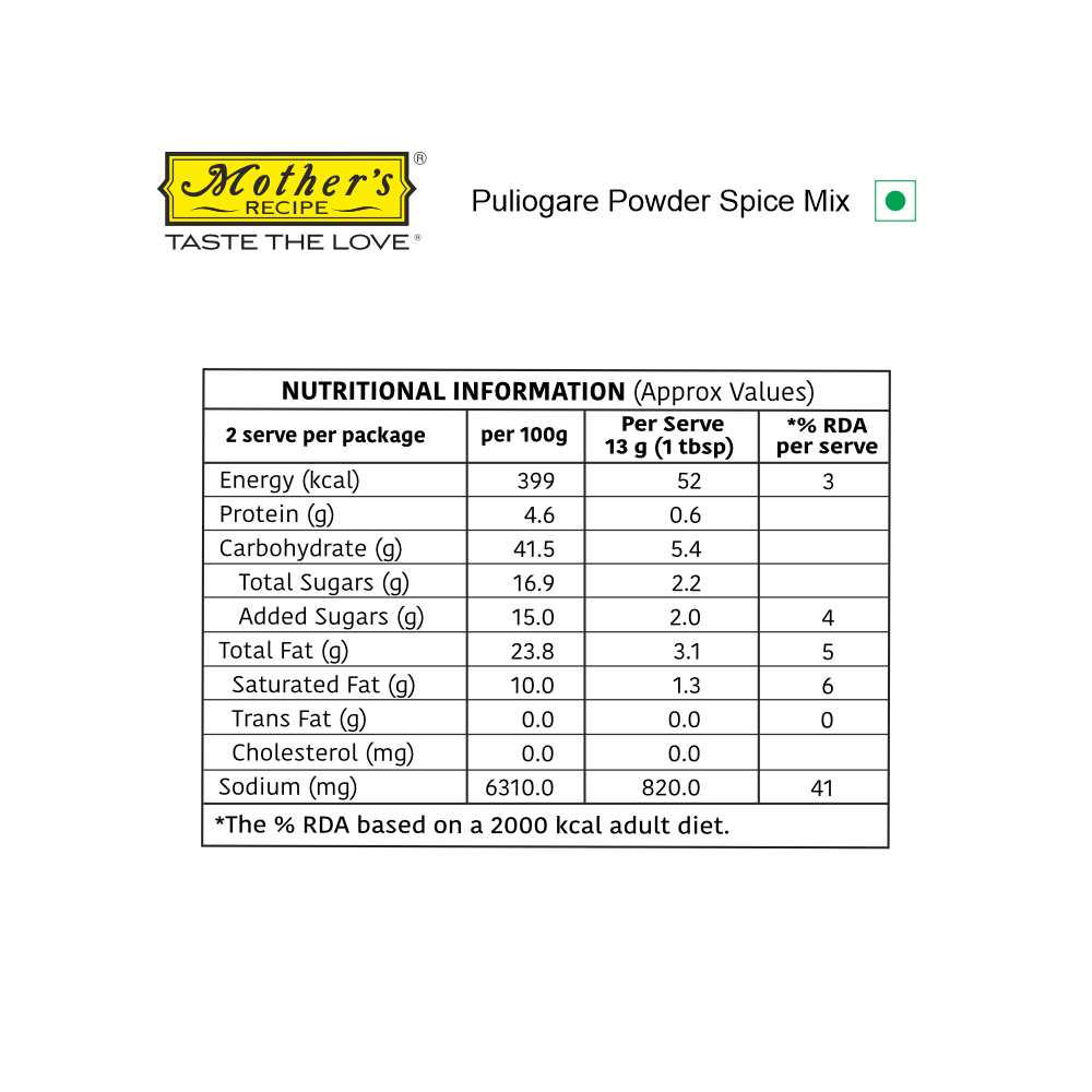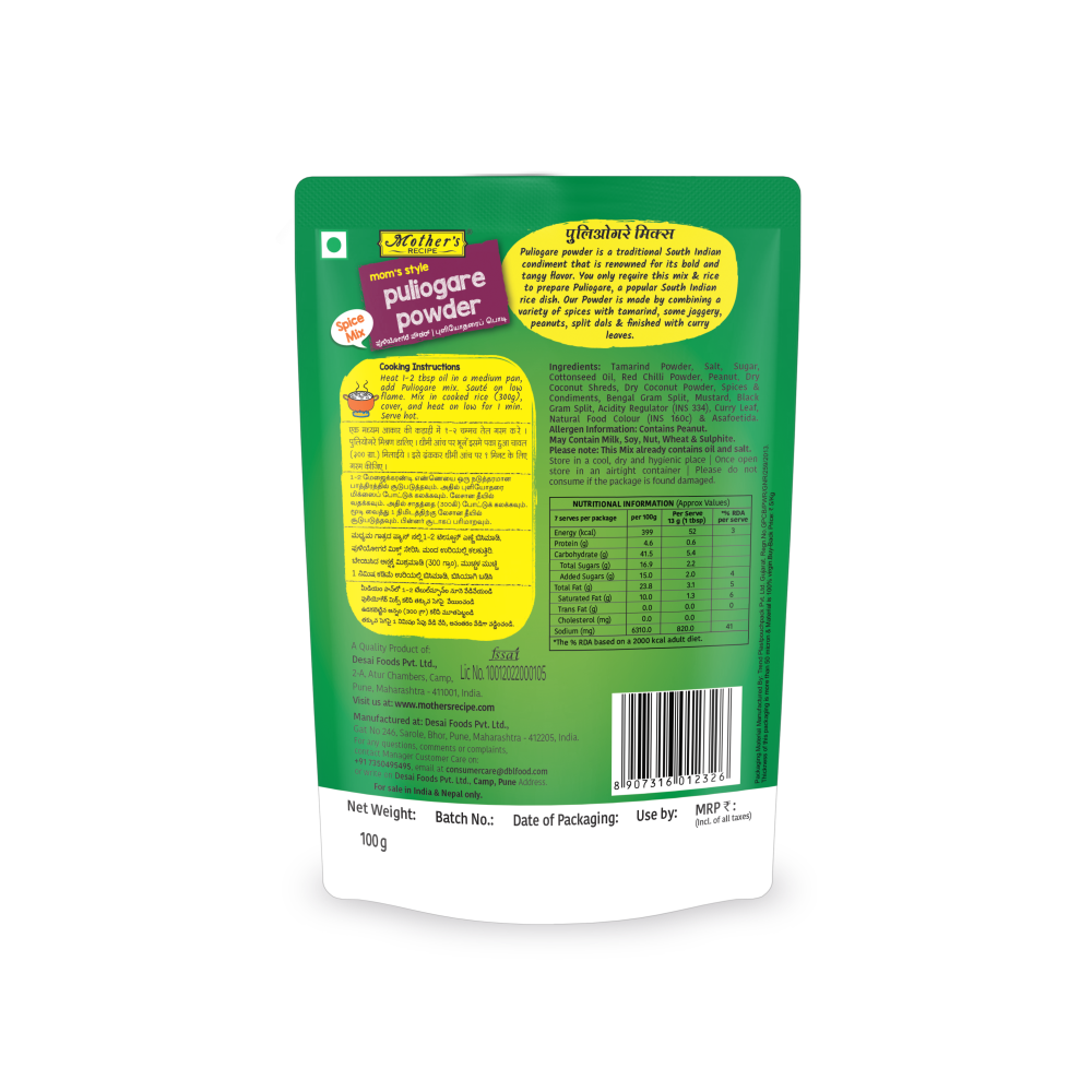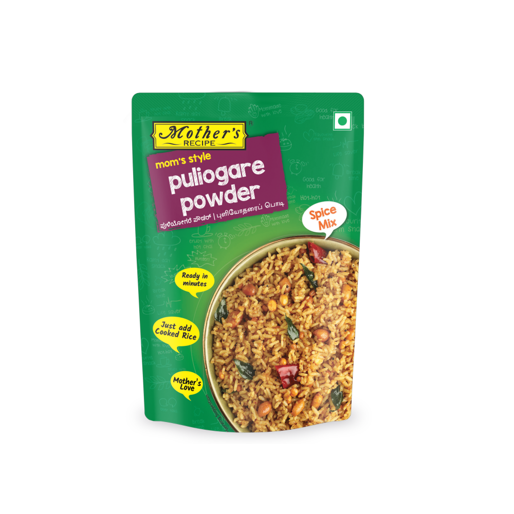 Puliogare Powder is a ready-to-use spice mix that brings the rich, tangy essence of South Indian tamarind rice to your kitchen. With the perfect balance of sour tamarind, sweetness from jaggery, crunch from roasted peanuts and dals, and the aroma of curry leaves, this mix helps you recreate the classic dish in minutes. Ideal for busy mornings or festive meals—just add to rice and enjoy!